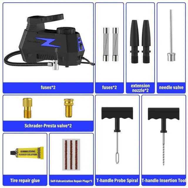 KEHIPI Tire Plug Repair Kit with 12V DC Tire Inflator, Tire Patch Tool Set Includes Spiral Probe Tool, Insertion Tool, 3 Repair Plugs, and Tire Repair Glue for Cars and Motorcycles (blue pump)