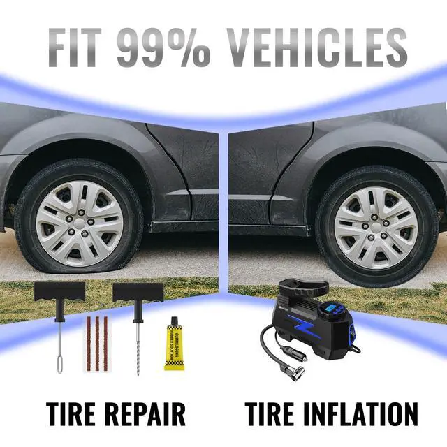 Complete Tire Repair & Inflation Solution: This all-in-one combo set provides both a tire plug repair kit and a powerful tire pump, making it easy to quickly repair and inflate your tires, whether at home or on the go.