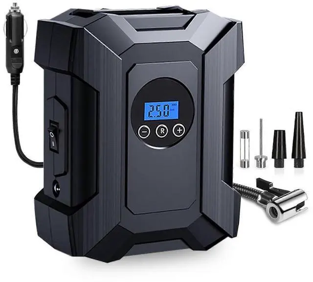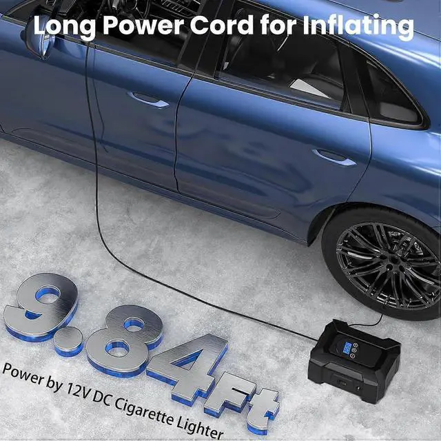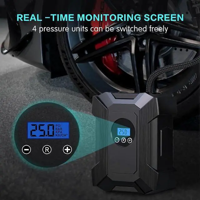 * **Digital Precision & Auto Shut-Off: ** Set your desired pressure (PSI, BAR, kPa, KG/CM) on the backlit LCD; the pump automatically stops to prevent over-inflation.