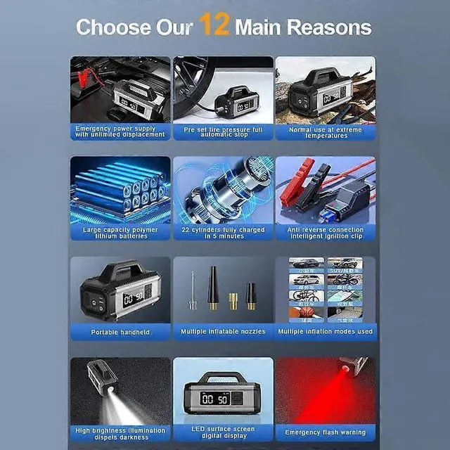 - **Rapid Inflation**: Upgraded 22mm metal cylinder fills a car tire in under 6 minutes.