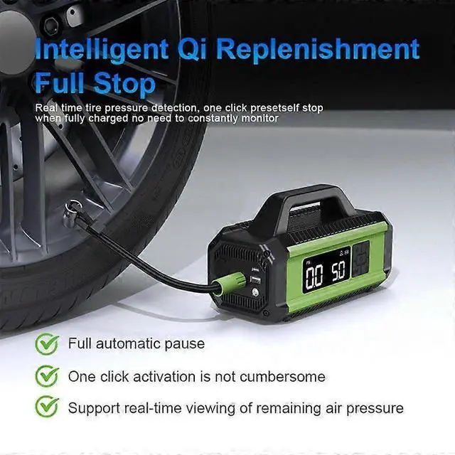 Meet the QB05 Portable Air Compressor, your all-in-one travel essential for quick tire inflation and emergency power. This compact, green device combines a high-performance inflator with a reliable power bank, ensuring safety and convenience on the go.