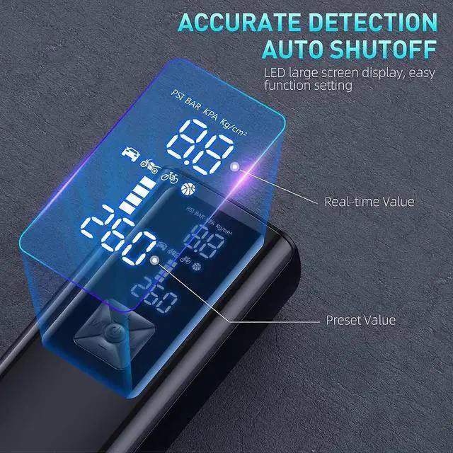 Smart Dual Display & Modes: Large LCD shows real-time pressure; choose from 4 preset modes (bike, motorcycle, car, ball) plus manual setting with PSI, KPA, BAR, KG/CM units.