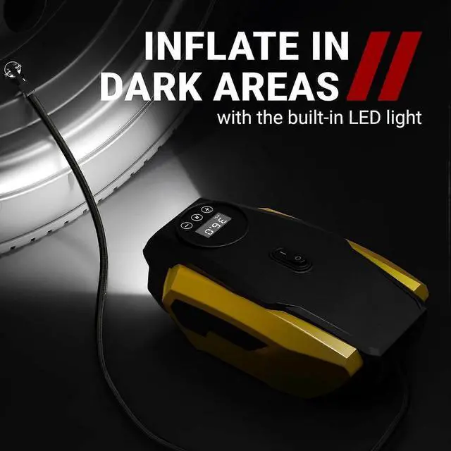 * **LED Light & Long Power Cord** The built-in LED illuminates dark areas, while the 9.8 -foot cord easily reaches all tires without unplugging.