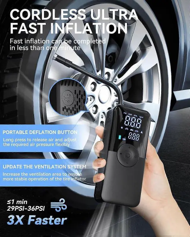- **3X Faster Inflation**: Inflates a small car tire (30-35 PSI) in just 40 seconds with a powerful 150 PSI metal motor.