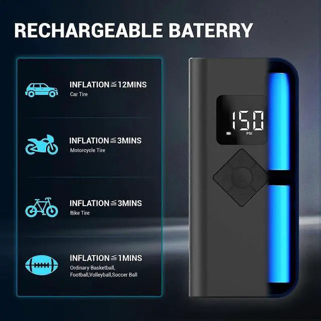 Experience rapid, cord-free inflation with our 150PSI portable air compressor. Perfect for cars, bikes, motorcycles, and sports balls, this lightweight pump delivers reliable performance anywhere.