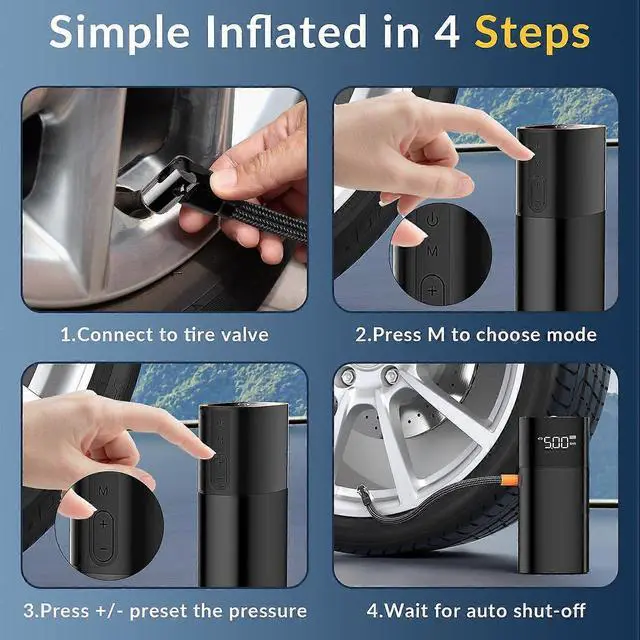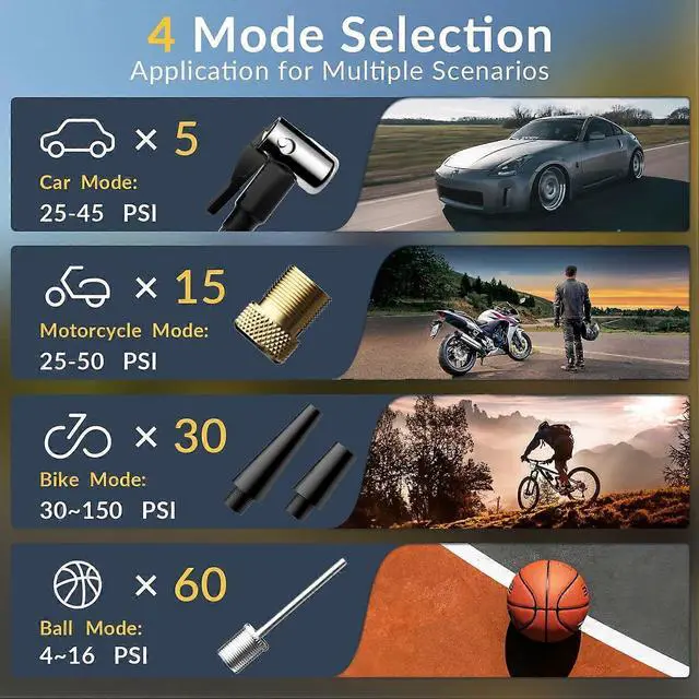 - **4 Smart Modes + Custom Setting**: Preset modes for bicycle, motorcycle, car, and ball; auto-stop at target pressure, plus a custom mode for precise inflation needs.