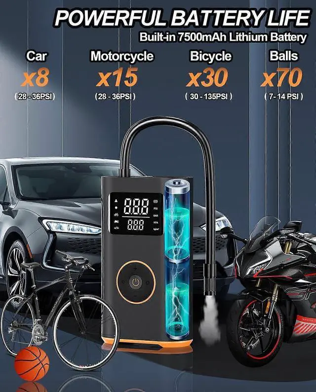 - **5 Modes & Digital Display**: Easily switch between bike, motorcycle, car, ball, and custom modes with real-time PSI/KPA/BAR/KG-CM readings
