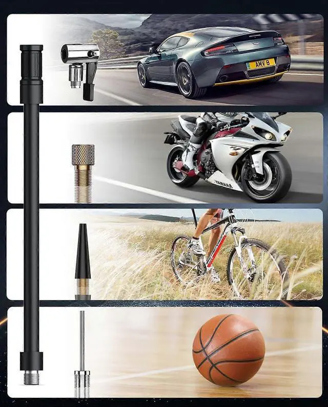 Ideal for cars, bikes, motorcycles, and sports equipment, this compact pump includes 4 adapters and a 15cm hose for versatile inflation needs.