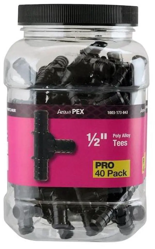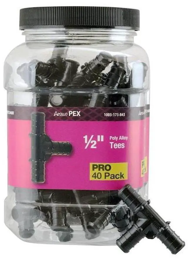 California Proposition 65: This product contains a chemical known to the State of California to cause birth defects or other reproductive harm. The ApolloPEX 1/2 in. Plastic PEX Barb Tee (40-Pack) is simple to install. ApolloPEX poly alloy fittings are the perfect alternative to brass in regions where water quality can negative affect brass. ApolloPEX barb fittings are a key component of the most economical potable water piping systems. Also capable of integration into hydronic heating systems, ApolloPEX poly alloy tees can be secured into place using copper crimps, stainless steel pinch clamps or stainless steel crimp sleeves (all sold separately). The ApolloPEX system is a comprehensive piping system comprised of brass fittings, poly alloy fittings, manifolds, valves, fasteners, tools and tubing designed for implementation in water delivery systems, simple or complex.