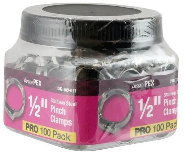 California Proposition 65: This product contains a chemical known to the State of California to cause birth defects or other reproductive harm. The ApolloPex 1/2 in. Stainless Steel PEX Barb Pinch Clamp (100-Pack) is simple to install and is designed for use with PEX pipe and barb fittings (not included). Made from corrosion resistant stainless for durability. Requires a pinch clamp tool (sold separately). ApolloPex fasteners are a key component of the most economical potable water piping systems. Also capable of integration into hydronic heating systems, ApolloPex fasteners can be can be used with brass and plastic fittings, valves, and manifolds (all sold separately). The ApolloPex system is a comprehensive piping system comprised of brass fittings, poly alloy fittings, manifolds, valves, fasteners, tools and tubing designed for implementation in water delivery systems, simple or complex.