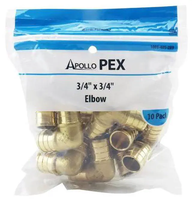 California Proposition 65: This product contains a chemical known to the State of California to cause birth defects or other reproductive harm. The ApolloPEX 3/4 in. Brass PEX Barb 90 Elbow (10-Pack) is simple to install. ApolloPEX barb fittings are a key component of the most economical potable water piping systems. Also capable of integration into hydronic heating systems, ApolloPEX elbows can be secured into place using copper crimps, stainless steel pinch clamps or stainless steel crimp sleeves (all sold separately). The ApolloPEX system is a comprehensive piping system comprised of brass fittings, poly alloy fittings, manifolds, valves, fasteners, tools and tubing designed for implementation in water delivery systems, simple or complex.