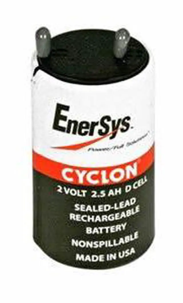 Enersys Cyclon 0810-0004 D Cell Battery 2V 2.5Ah Sealed Lead Voltage: 2 Volts Capacity: 2.5 Ah Chemistry: Sealed Lead Acid Dimensions: Diameter 1.35"(34.3mm) x Height 2.41"(61.2mm) [Height with Terminals 2.68"(68.1mm)] Weight: .39 lbs. Termination: F1 (.187" Quick Disconnect Tabs) This Battery Fits the Following: ADI / Ademco P3141 Alphasource AS10704M Battery Center 0810-0004 Chloride 1000010124 Dantona CYCLON-D Devine UB180EM Dual Lite 12-261 Dual Lite 12-542 Dual Lite EX21004X Dual Lite EX3GEMPH Eagle Picher Batterie CF2V2.5 ELS EDS225 Enersys 08100004 First Alert RL101 GE 47B0258801912 GE 47B025AA01 GE 8219 GE UB180UN Hawker/Gates Energy P 0810-0004 Hawker/Gates Energy P 08100274 Hawker/Gates Energy P 92201DW Hawker/Gates Energy P D CELL Hawker/Gates Energy P P321 Interstate Batteries ASLA1210 JM&W 47B025AA01 JM&W 912 O'Donnell 7704S Panasonic 08100004 Sonnenschein X2100 Sontrix 7747 Sontrix 7748 Sontrix SP1508 Sun Battery 8100004 Trio Lighting TL930082 Unipower B10704 Universal Power Group C6280 S6013-S SLAD