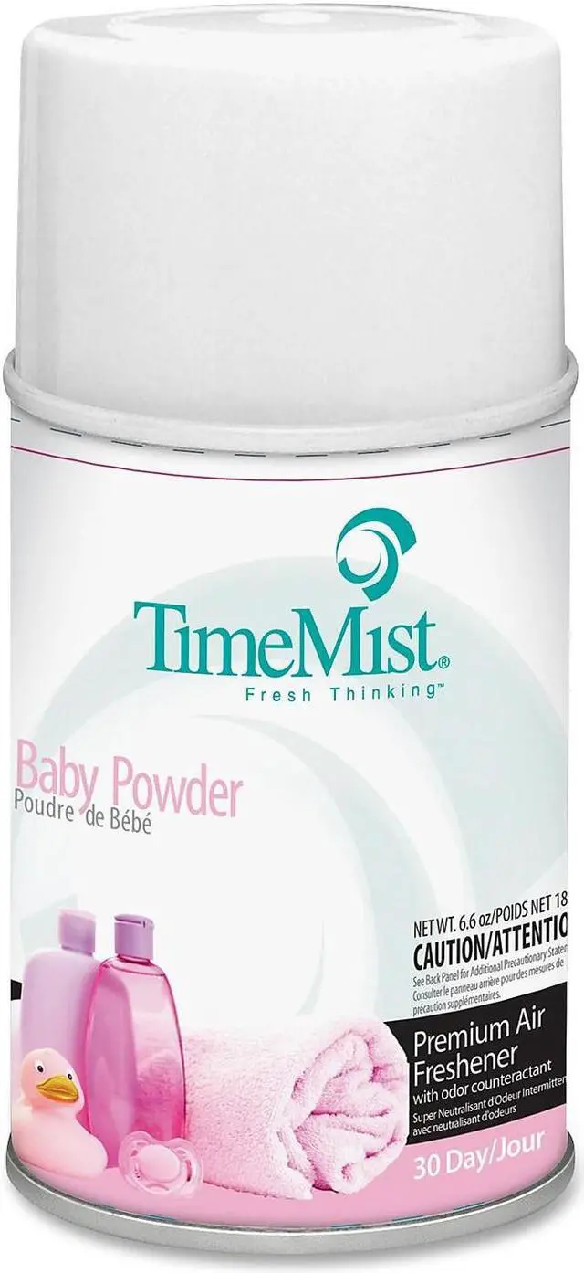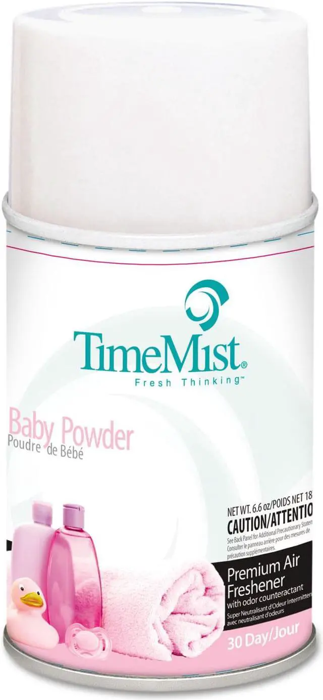 For use in TimeMist full-sized, metered fragrance dispensers. Neutralizes stubborn odors swiftly and provides lasting aromatherapy. Baby Powder Scent. Lasts 30 days¢. Sold as 1 Each.