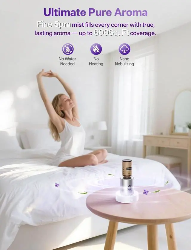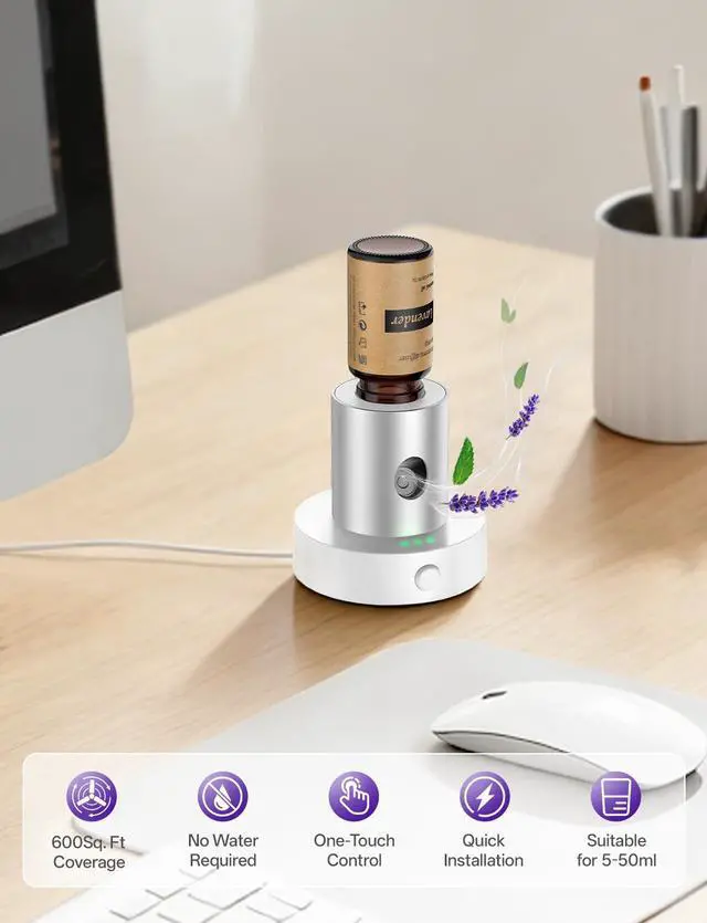 The diffuser can effectively fragrance spaces up to 600 sq ft. For optimal scent concentration, we recommend using it in enclosed areas of 50–300 sq ft.