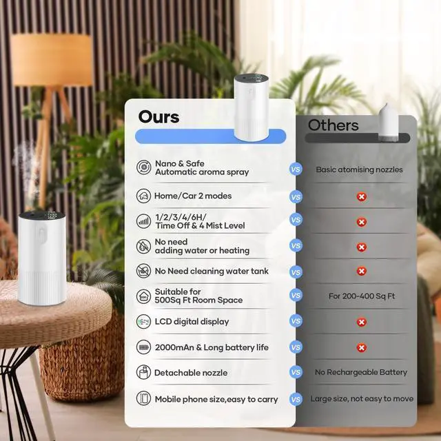 • [Waterless Essential Oil Diffuser] - Patented waterless nebulizing technology transforms your favorite 100% pure essential oils into a nano-mist without heat or water. This natural, more convenient, and safer alternative to traditional ultrasonic diffusers gives you a pure aromatherapy experience.
