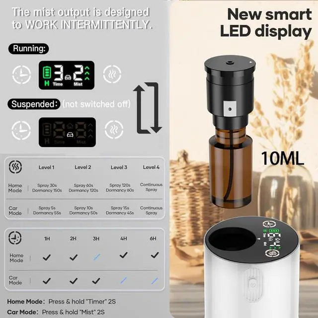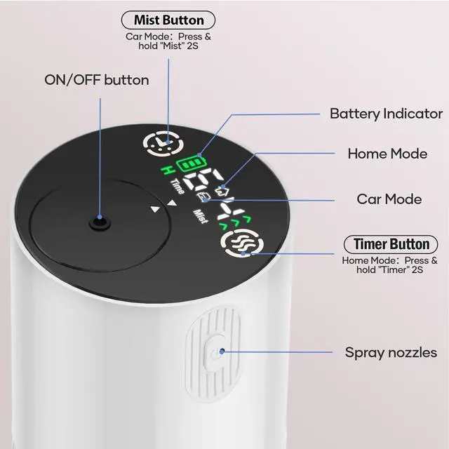 • [Home/Car 2 Modes & LED Display] - JUJSEN cordless oil diffuser has two modes: home and car. Featuring a fully intelligent LED digital display such as a Battery indicator, Modes, Mist levels, Timer, and more. The digital screen of the oil diffuser will go into sleep mode after 30 seconds to save power and can be woken up by clicking any button.