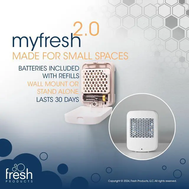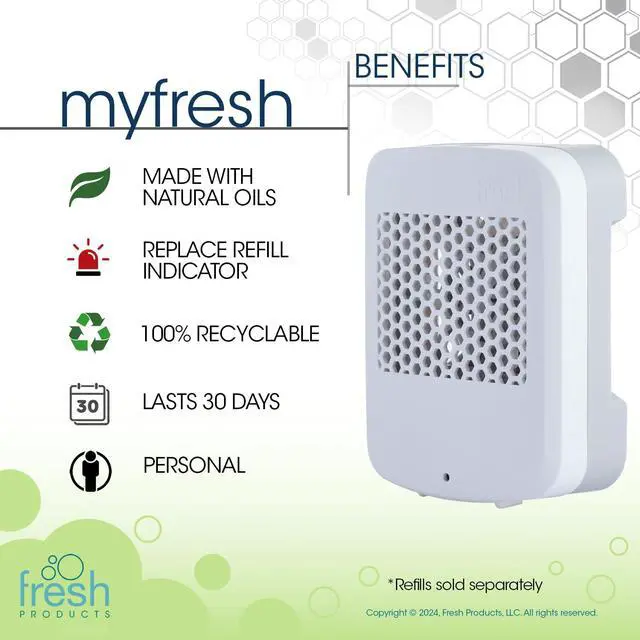 The myfresh air freshener by Fresh Products provides a small space saving option that packs a punch. The plastic air freshener refills carry a patented fragrance load to ensure a lasting fragrance for 30 days. This motion activated, battery operated unit reminds you after 30 days to change the refill, and we make it easy by providing a new battery with every refill pack you open!
