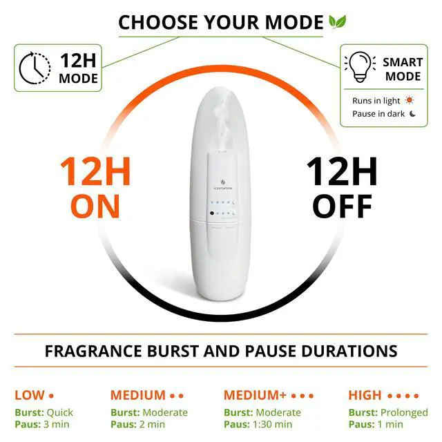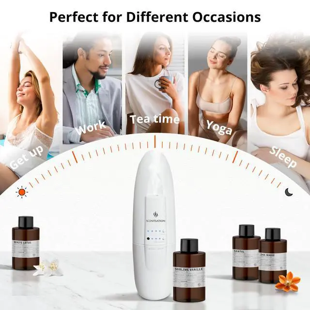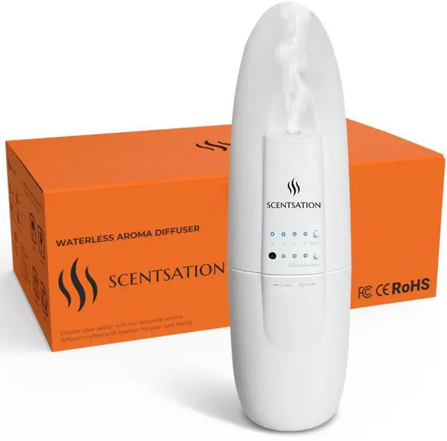 The SCENTSATION diffuser enhances mood and productivity with soothing scents. It operates quietly, blending into the background, creating a peaceful and focused environment.