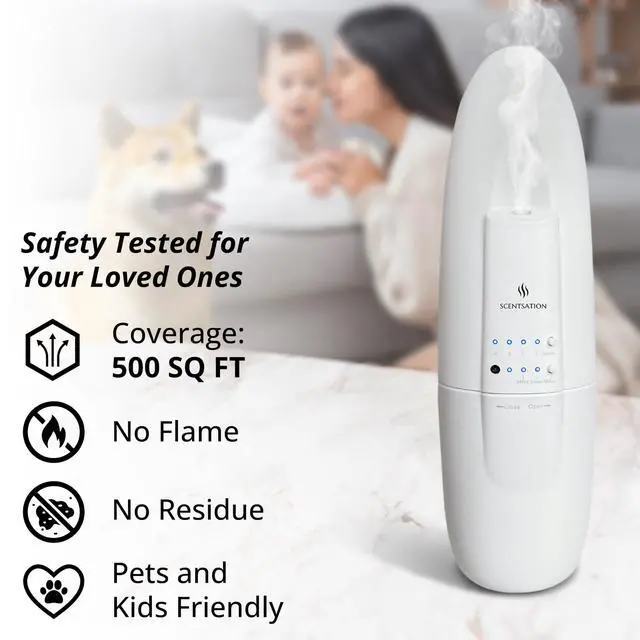 The SCENTSATION diffuser covers up to 500 square feet, ideal for large spaces like living rooms, offices, or commercial areas, ensuring a luxurious, hotel-like scent experience throughout.