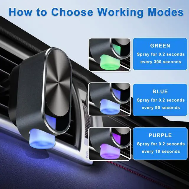 THREE ADJUSTABLE MODES: Press and hold the start/stop button for 1.5 seconds to turn on. Then press the strong fragrance mode (purple) for the first time, the medium mode (blue) for the second time, and the light fragrance mode (green) for the third time. Then continue to press and hold the start/stop button for 1.5 seconds to turn off. You can adjust the mode according to personal preferences and space size.
