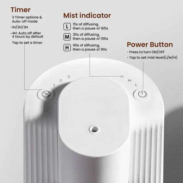 Customizable 3 Mist Levels & 3 Timers: Choose from Low (15s on/165s off), Medium (30s on/150s off), or High (90s on/90s off) mist modes to match your preference. Pair with 1H/2H/3H timers for auto-shutoff, ensuring energy efficiency and worry-free use. Covers ~30 spaces like bedrooms, offices, or cars with consistent fragrance.