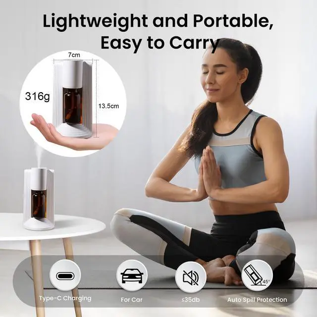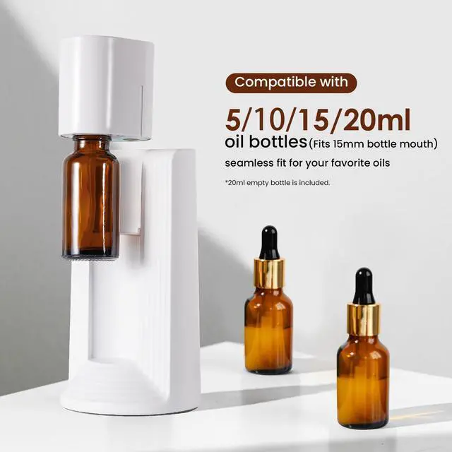 Leak-Free & Tool-Free Setup in Seconds: Specially engineered with a 45° tilt auto-shutoff feature to prevent spillssolving common leak issues of old models. Just twist your 10/20mL retail essential oil bottle directly onto the nozzle (bottle included!). Weighs just 300glightweight and easy to place anywhere.