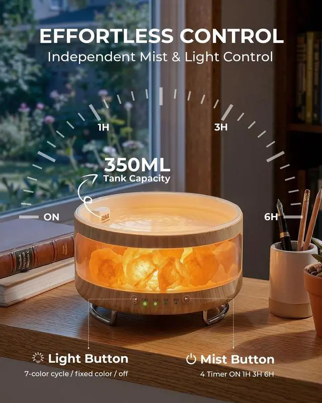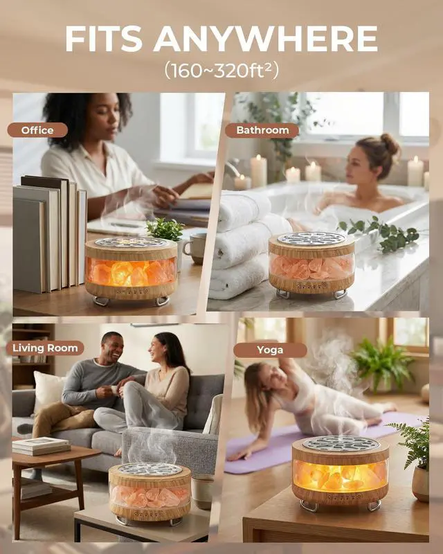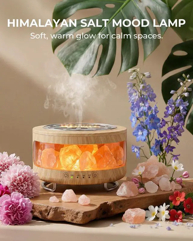 4-in-1 Multifunctional Essential Oil Diffuser This 4-in-1 unit integrates essential oil diffuser, cool mist humidifier, ambient night light and Himalayan salt lamp. All functions work together or separately, serving as a premium aromatherapy scent diffuser for home, bedroom humidifier and difusor de aromas para casa, bringing all-around convenience to your living space.