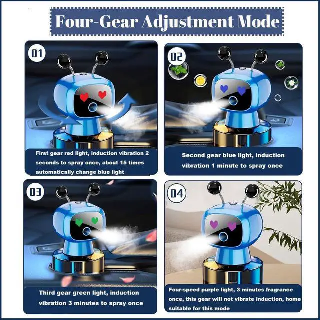 Long press the power button to turn on the first gear. The red light will spray once every 3 seconds. The blue light in the second gear will spray once every 60 seconds. The green light in the third gear will spray once every 180 seconds. The green light in the fourth gear will spray once every 180 seconds (the fourth gear will spray fragrance without sensing vibration, while the other three gears will only spray fragrance after sensing vibration). Long press to turn off the device.