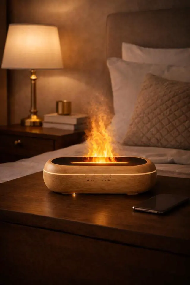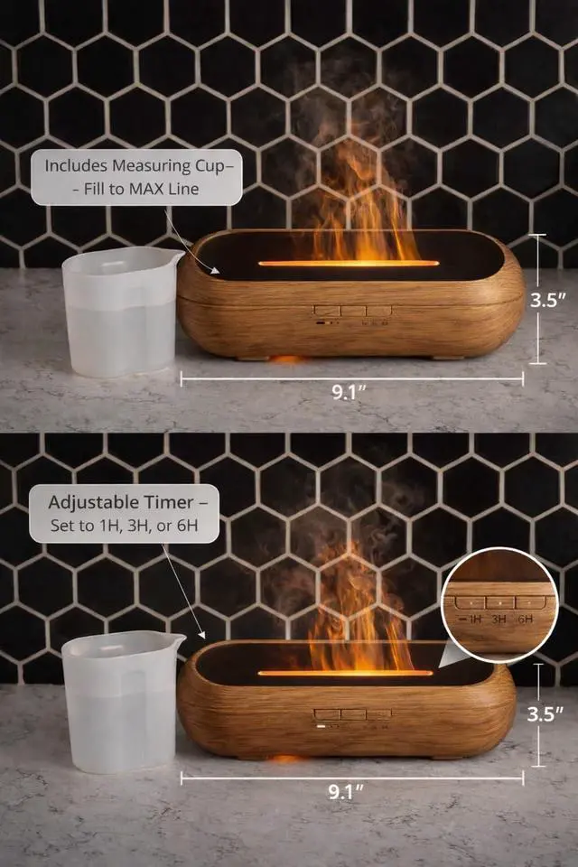 Transform any space into a calming retreat with this Flame Effect Aromatherapy Diffuser, designed to combine modern style with soothing ambiance. This essential oil diffuser features a realistic flame-like mist paired with soft LED lighting to create a warm, relaxing atmosphere that enhances any room. Easy to set up and simple to use, just fill the water tank to the indicated line, add a few drops of your favorite essential oils (not included), and power on using the included USB cable. Built-in controls allow you to turn the diffuser on or off, cycle through multiple LED light modes, and set a timer to fit your daily routine. Available in both a sleek white finish and a natural wood-grain design, this compact diffuser complements bedrooms, living rooms, offices, yoga spaces, and meditation areas. Whether used for relaxation, focus, or decorative ambiance, it delivers both visual appeal and gentle mist in one elegant design.