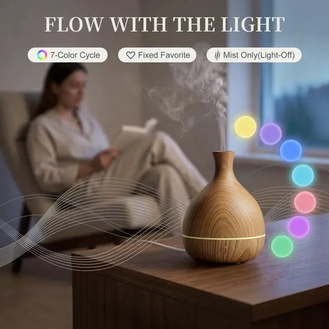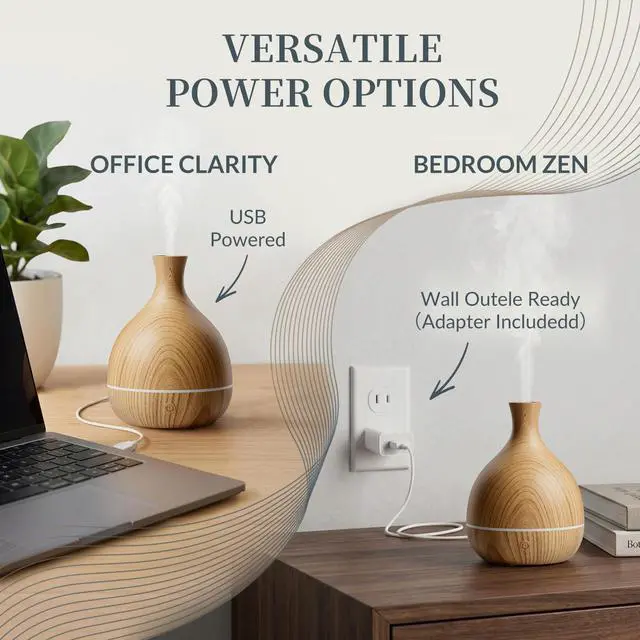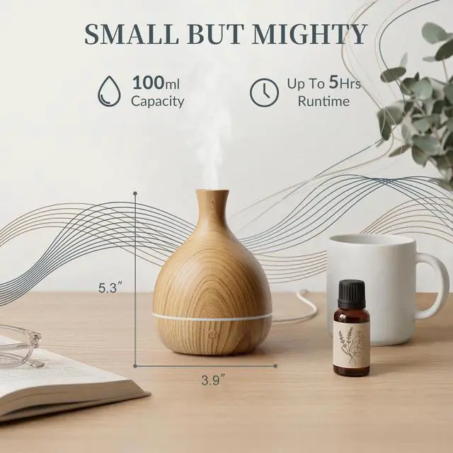 Essential Oil Diffuser with Adapter, 100ml Small Aromatherapy Scent Machine for Home & Office Desk, 7 Color LED Cool Mist Humidifier, Auto Shut-Off, Wood Grain