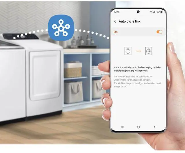 The SmartThings App sends you end-of-cycle notifications and lets you remotely start, stop, or delay your smart washer and dryer from your phone. *