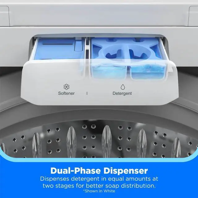 Power Wave 360 Agitator Multi-directional water flow delivers a powerful clean, effectively removing tough stains. *Shown in White Dual-Phase Dispenser