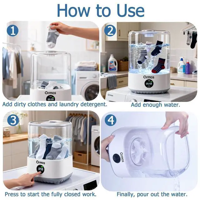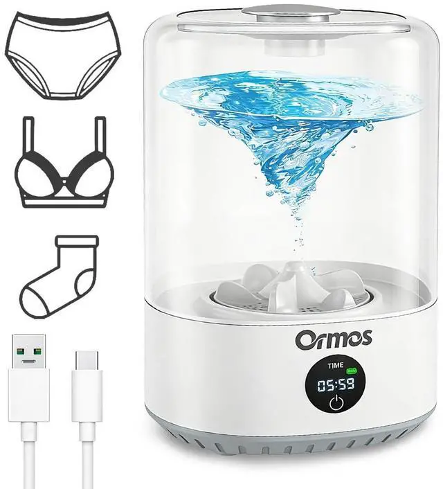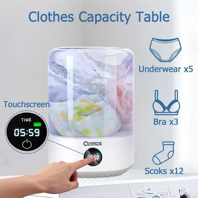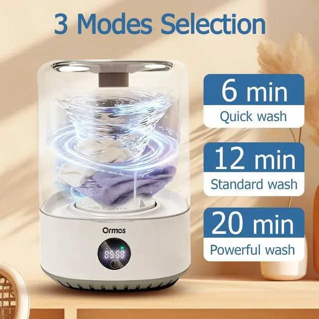 Experience laundry freedom with the ORMOS YH-X2 Portable Mini Washing Machine. This compact 4L washer liberates you from laundry room constraints, allowing you to clean clothes in dorms, apartments, hotels, RVs, or while camping. The powerful 7.4V DC motor and specially designed wave wheel create strong water flow for effective stain removal while maintaining quiet operation. Navigate washing options effortlessly with the bright LED color touch screen that displays battery life and wash progress. The built-in 5000mAh rechargeable battery delivers up to 8 high-speed wash cycles on a single chargeno outlet required. Perfect for baby clothes, underwear, and socks, this 1.2kg lightweight washer features a transparent, leak-proof tank with a wide opening for easy filling and cleaning. The Type-C charging port and included 1m USB cable ensure convenient recharging wherever you go.
