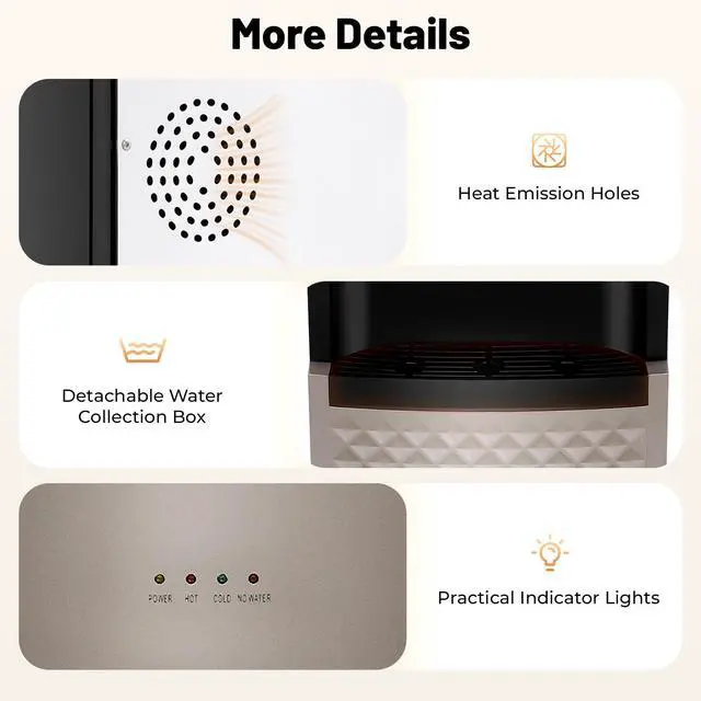 Efficient WorkingThe product comes with 500W heating power and 75W/90W cooling power, making the cooling capacity up to 0.39Gal/H/0.53Gal/H, and the heating capacity up to 1.32Gal/H, allowing you to enjoy hot or cold water quickly.