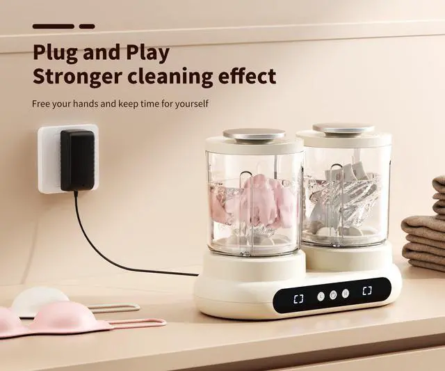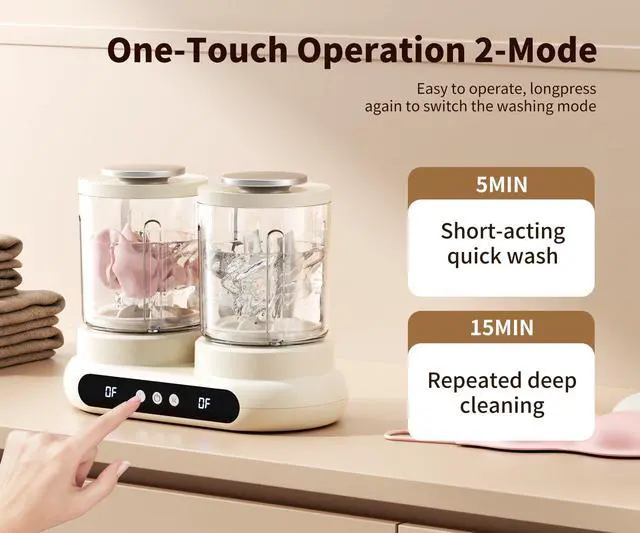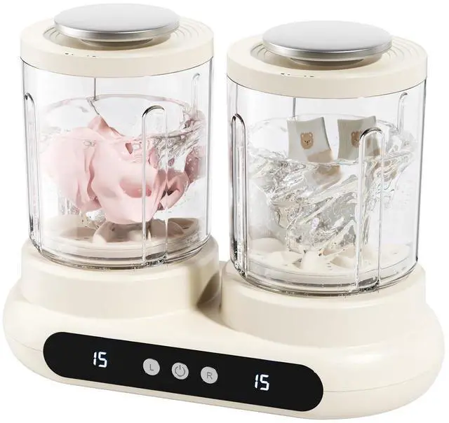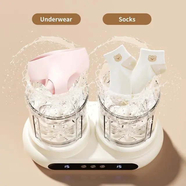 Independent Timer & Versatile CompatibilityThis underwear washing machine features dual-tub independent timer knobs. Simply load clothes, add water, and press to start (for optimal washing results, add water to 2/3 of the tub capacity). It is compatible with various laundry detergents, including soap shavings, pre-measured laundry pods, powder detergent, liquid detergent, laundry sheets, and laundry bars choose freely as you like.