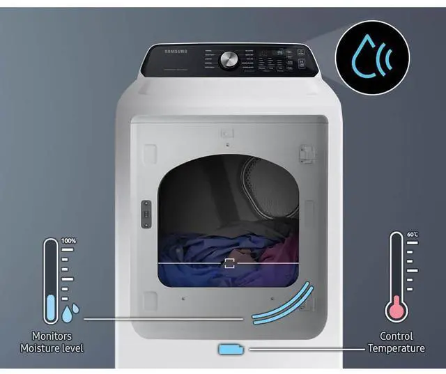 Samsung's 7.4 cu. ft. Large Capacity Top Load Smart Dryer with Wi-Fi connectivity lets you receive end-of-cycle alerts and schedule laundry right from your smartphone. * Sensor Dry automatically optimizes the time and temperature of your drying cycle to help prevent overdrying.