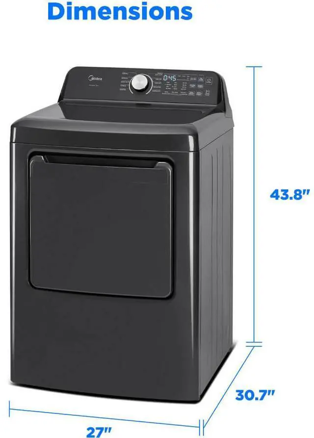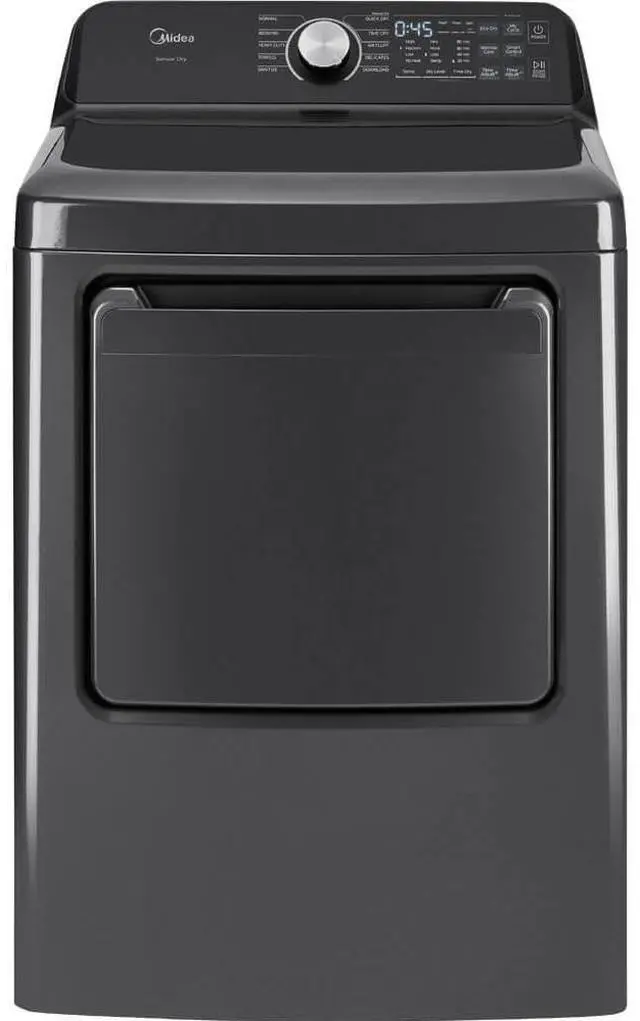 Midea's 7.0 cu. ft. Front Load Electric Dryer delivers exceptional drying performance and capacity in a modern, metallic grey finish. To help simplify laundry day, Sensor Dry detects moisture and automatically adjusts drying time to get your clothes perfectly dry. 7.0 Cubic Foot Capacity