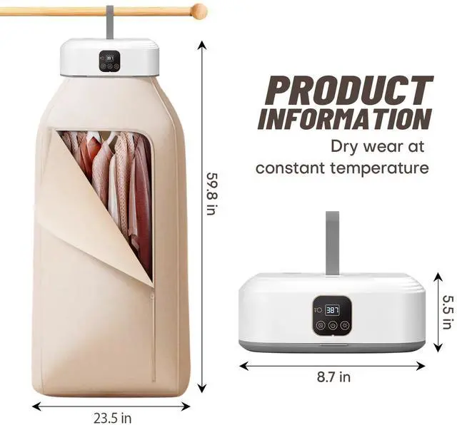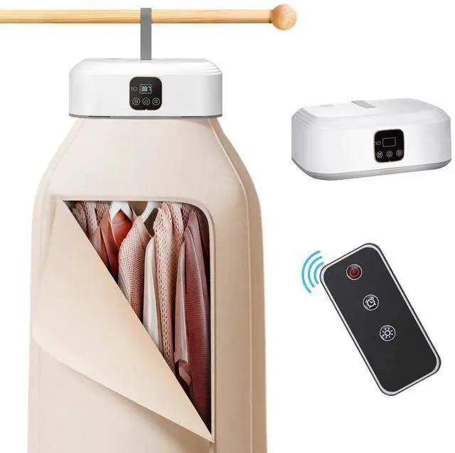A foldable clothes dryer with drying bag, ideal for travel and small spaces. Includes remote control for hassle-free use.