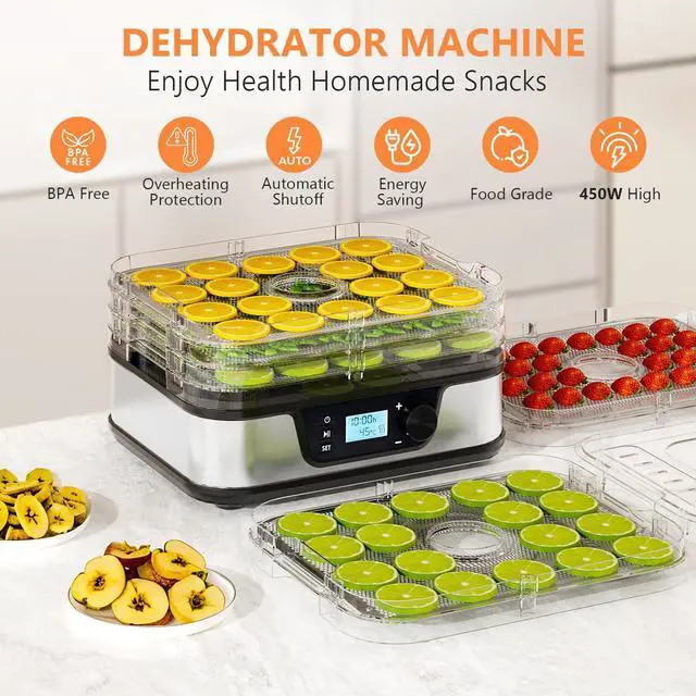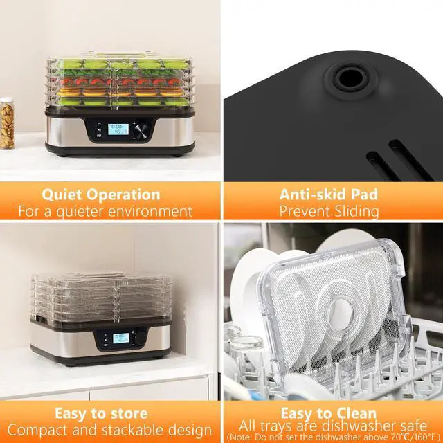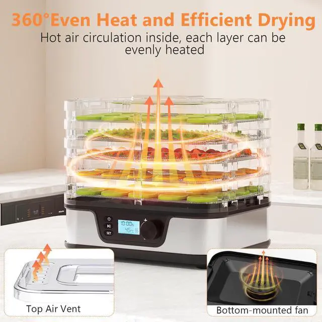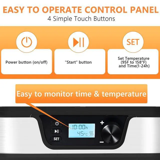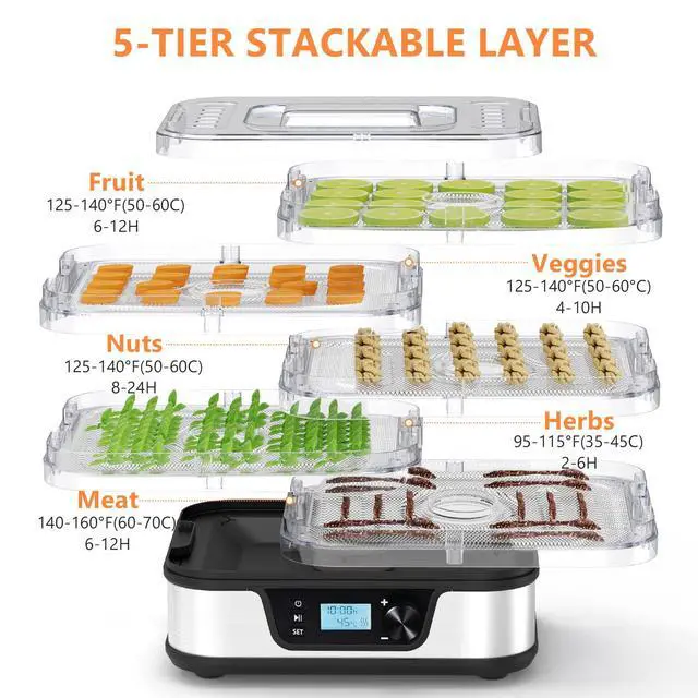 Temperature Control & 72H TimerEasily set the temperature from 95167°F and timer up to 72 H in half-hour increments. This small dehydrator offers precise, customizable drying for fruits, herbs, vegetables, and meats, removes moisture from food and retains most of its nutritional value.