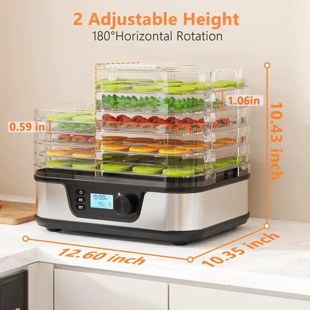 5 Height Adjustable TraysThe food dehydrator machine features 5 BPA-free trays that offer two adjustable heights, with a minimum height of 0.59 inches and a maximum height of 1.06 inches, providing ample drying space for various food sizes that allow you to dry different foods, fruits, and veggies at once.