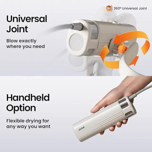 Hands-Free Drying: The Jirpet Harmony 1 Pet Neck Dryer features an innovative neck-hang design. With your hands freed, you can use both hands to comfort your pet during drying. Its equipped with a universal joint that enables 360° direction adjustmentdirect the airflow as you wish and easily complete fluffing and other grooming steps