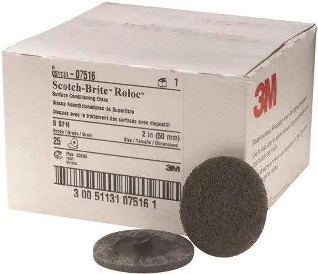 Scotch-Brite Roloc Surface Conditioning Disc 075162 in Super Fine 25 per box 1 boxes per case. Quickly removes cork or paper gaskets and form-in-place gasket material prior assembling drive train components engine blocks heads and valve covers. Use with 3M Roloc Disc Pad 05539. Best used on aluminum parts.