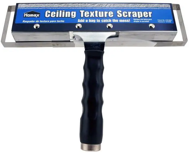 Features:Removes popcorn acoustic ceiling texture Connect to standard extension handle Special design prevents gouging of ceiling surface A typical 10-foot x 10-foot ceiling can be completed in 30 minutes or less10-inch bladeUnique bag attachment captures texture as it is removed What's In The Box:Homax 6100 Ceiling Texture Scraper