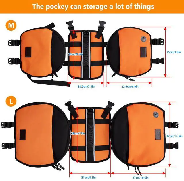 LARGE-SIZED INFO: Please measure the size of your dog before placing an order. The neck: 33- 71cm / 12.9 - 27.5inches; The thoracic part: 87-120cm/34.2-47.2 inches. There are total five parts of this dog saddle bag can be used to adjust the length.
