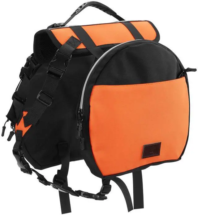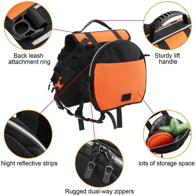 DURABLE MATERIAL: The dog saddle bag is made up of Oxford material, which is splash-proof, wear-resistant and durable. The back pad is adopted by a mesh fabric, so it is softness and air permeability, so these prominent features doesnt do harm to your dogs fur. Moreover, the reinforced handle grip enables you to get hold of your dog in case of emergency.
