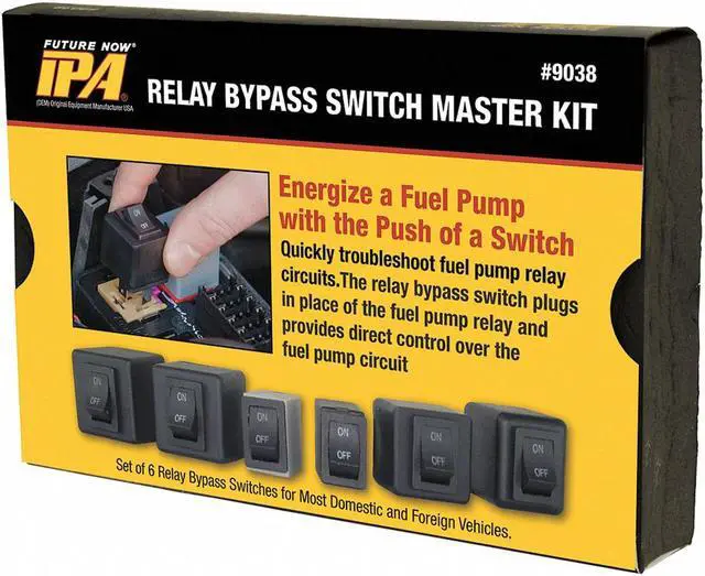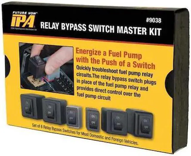 Fuel Pump Relay Bypas Master Kit, Scan Tool, Used For Relays, Operating Range 20A continuous, 30A surge (12V), For Use On Most Domestic, Japanese, Korean and German Applications, Features Energize a Fuel Pump with the Push of a Switch. Actuates Fuel Pump When The Engine Is Not Running. Plugs in Place of Relay. Controls Fuel Pump Independent of Key on Systems., Material Plastic, Number of Pieces 6, Application Most Domestic, Japanese, Korean and German Applications. This item has been restricted from sale in the following state (s): []