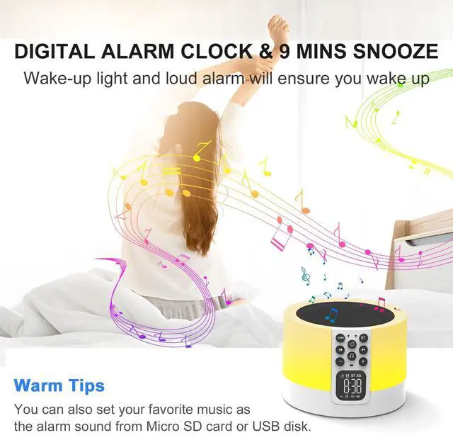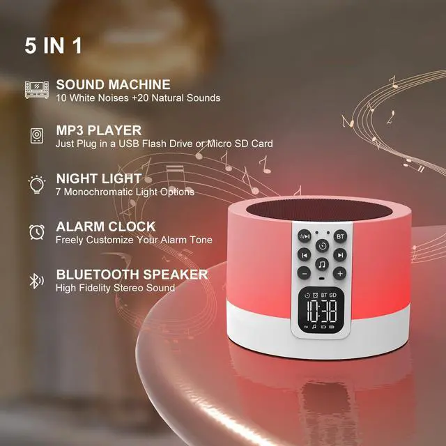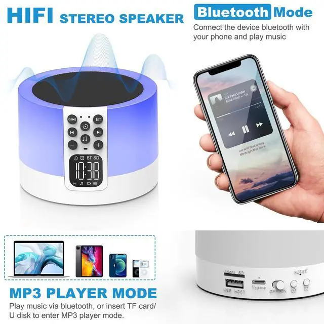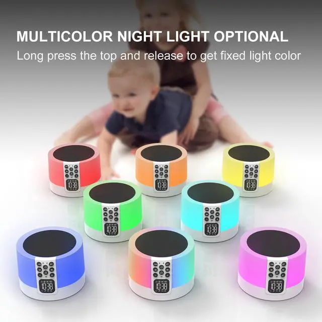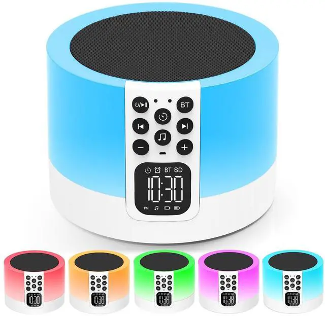 Multi-functional Nightlight Bluetooth Speaker- A practical combination of bluetooth 4.0 hi-fi speaker, white noise machine, sleep sound machine with timer, multi-color touch control led lamp, kids night light for bedroom, bedside alarm clock for kids, MP3 player supporting USB Flash Drive and micro SD card input. Perfect for bedroom, living room, kitchen cooking, exercising, party, camping, or outdoor activities etc. Hi-Fi Stereo Superb Sound Quality- The wireless bluetooth speaker achieves wonderful stereo sound with high-power drivers, with clear undistorted sound and powerful bass, you can enjoy super high sound quality. Compatible with all bluetooth devices, the portable bluetooth speaker with light is perfect for enjoying music anytime. In addition, a built-in microphone helps to free your hands when a call comes in. Just press the "play/pause" key at the bottom to enter hands-free mode. Touch Lamp with Multiple Light Modes- Tap the top of the mesh to easily switch between warm white lights with 3-level brightness, breathing lights with multi-color cycles, and atmosphere lights with 48 RGB colors according to your mood. You can also choose a fixed color as the ambient light. Simply long press the top until your favorite color is displayed. In addition, the led night light has a music light mode, the light color will synchronize with the rhythm of the music. Digital Alarm Clock & Free Set Alarm Sound- This bluetooth alarm clock makes it easier to get up and wake you up with a pleasant alarm sound and light. And with a USB Flash Drive or Micro SD Card, you can freely set your favorite music as your alarm ringtone. Simply create a folder named "ALARM" on the Micro SD card or USB stick, put your favorite song (MP3, WMA, FLAC) in it, and then connect Micro SD or USB stick to the device. When the alarm goes off, touch the top mesh to enable snooze. Portable Sound Machine & Sleep Timer-Turn on the sleep aid to create a peaceful sleeping environment that helps crying babies calm down and fall asleep. Choose from 16 soothing sounds such as white noise, bird, wave, campfire, streams etc. With the sleep aid your children can make it easier to fall asleep. And the bluetooth alarm clock speaker features a 15, 30 or 60 minute sleep timer, natural sounds and lights can be turned on all night or automatically turn off when your timer expires. Best Gift Choice- The night light bluetooth speaker integrates a variety of functions in one, and its appearance is exquisite and convenient to carry, which is very suitable for both indoor and outdoor. It is an ideal gift choice for birthdays, Easter, Halloween, Christmas, Children's Day, Valentine's Day, Thanksgiving, anniversaries, weddings, Mother's Day, Father's Day, etc. Suitable for girls boys 10 11 12 13 14 15 16 years old and up, teenagers, kids, friends, lovers and family members.
