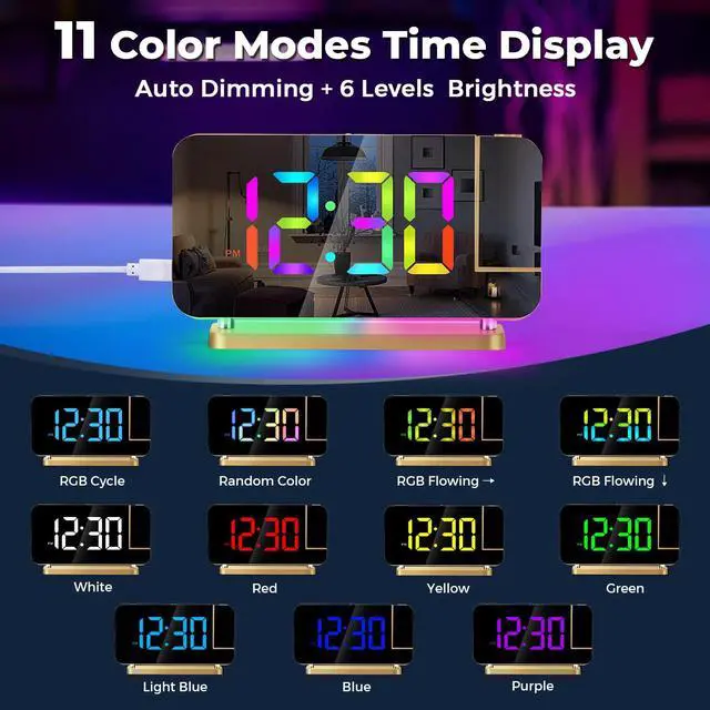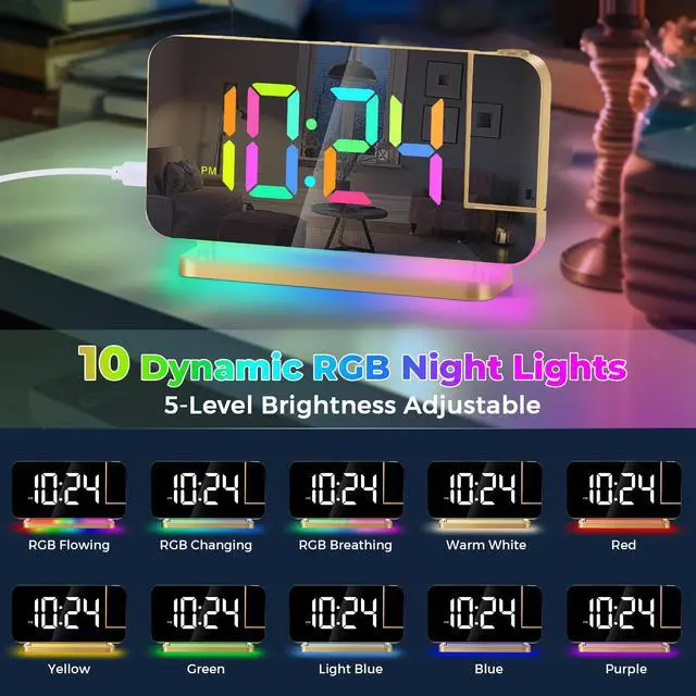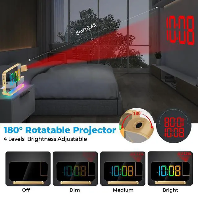 Hd Projection Alarm Clock The projection alarm clock can be rotated 180°, and the projection brightness can be adjusted in 4 levels.Led Rgb Colorful Clock The RGB alarm clock has 11 color display modes (4 dynamic modes + 7 fixed modes).