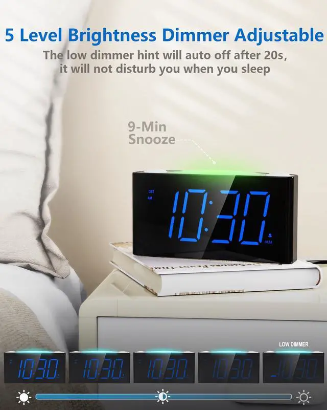 7.5Large Number Alarm Clock & 5 Levels Brightness DimmerHighly visible time readout on the display you can view from a far distance without putting your glasses on. especially for kids,teens,boys or girls,the elderly, also for those with vision issues to overcome blurry eyes. set the brightness to your comfortable level - all the way from exceedingly bright to exceedingly dim. and sleep without disturbing glare, simply adjust the brightness level.