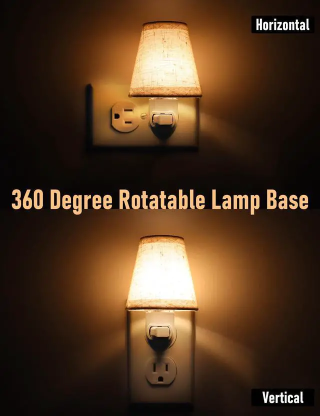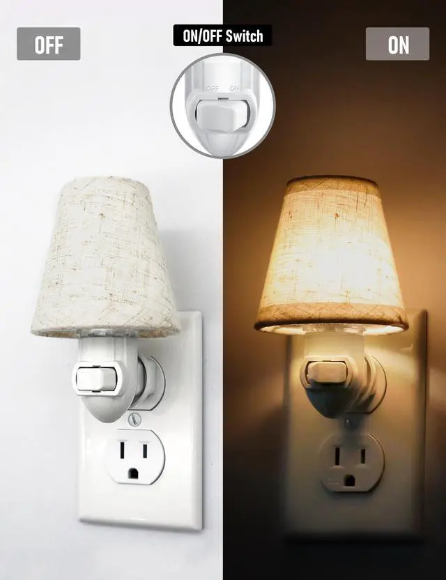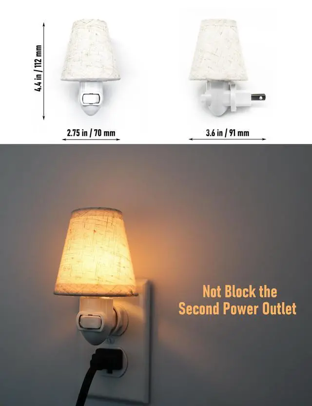 This plug-in night light is a vintage style design with a linen fabric shade and an energy-saving 0.5W 2200K E12 LED bulb, which provides soft and non-glaring nighttime illumination. Especially suitable for baby nursery, it is also suitable for bedrooms, hallways, kids' rooms, kitchens and other places. It comes with replaceable shades and E12 bulbs for ease of use and customization. The light's base is made of flame retardant plastic, which is safe and reliable. The clever design keeps the night light from blocking other sockets. And the light base can be rotated 360 degrees, so you can adjust the angle of the night light as you need. Manual switch, light up only when you need it. Energy-saving and environmentally friendly, ultra-low energy consumption, only 14.6 kWh a year (based on 8 hours of work per day)